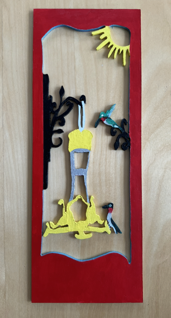 This panel measures 5 inches in length by 8 inches tall by .25 inches deep. It is constructed with mdf board with vibrant acrylic paint colors.