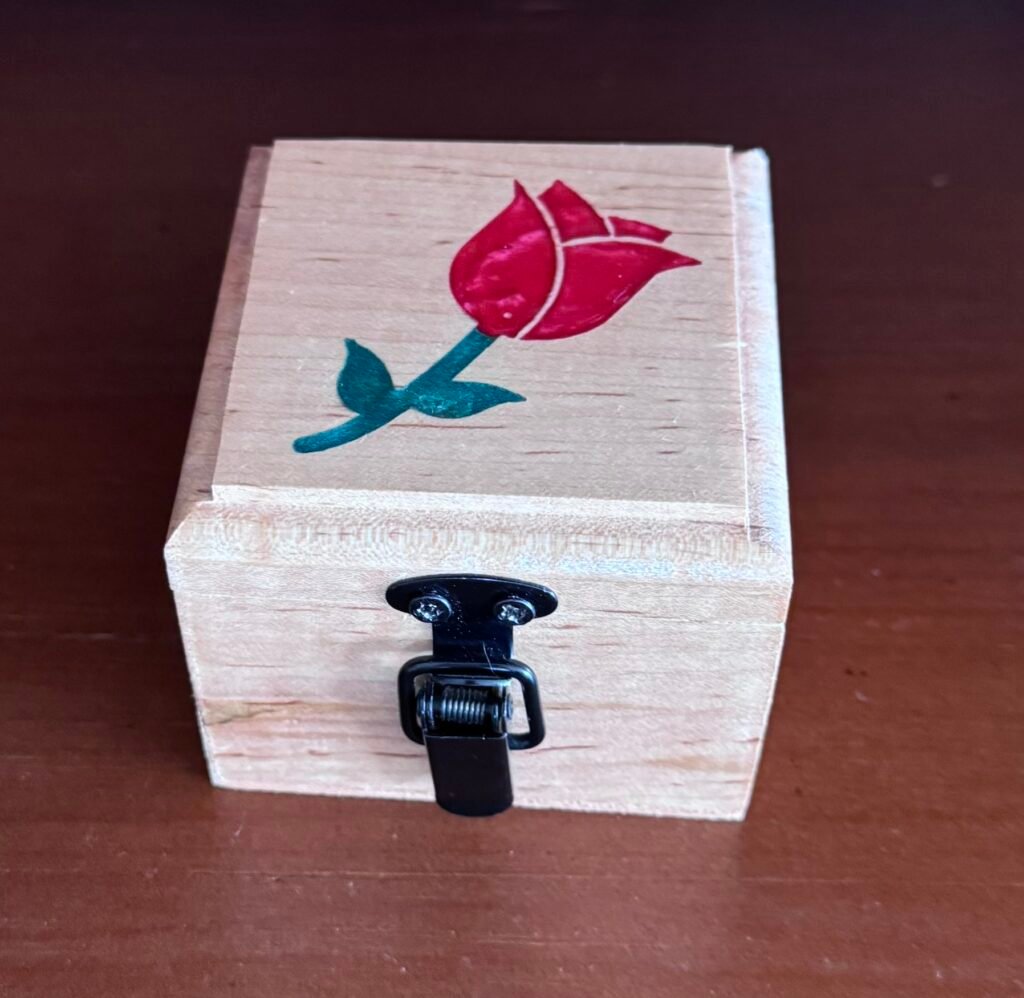 This box measures 3 inches in length by 3 inches tall by 3 inches deep. It is constructed with natural maple, epoxied rose and clear finish, giving this